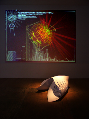 L'exposition «Produit sphérique» présente des formes géométriques générées par la «superformule» de Gielis dont les paramètres varient selon un analyse acoustique de l'espace de la Chambre Blanche et de celui d'Espace Virtuel, à Chicoutimi.