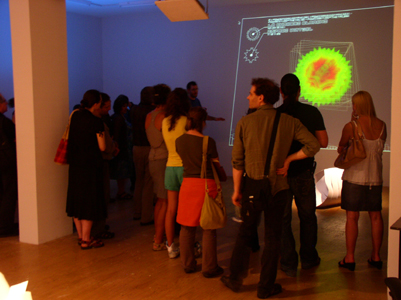 La table réactive présentée au CCA, développée par les deux artistes et les membres de FluidSurface, montrait des formes d'harmoniques sphériques tirées d'un générateur présenté dans un autre coin de l'exposition.